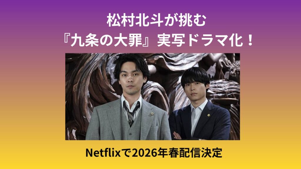 2026年春、Netflixで『九条の大罪』がいよいよ実写ドラマ化します! 松村北斗さんが若手弁護士・烏丸真司を演じ、柳楽優弥さんら心強いキャストが集まりました。 この記... -