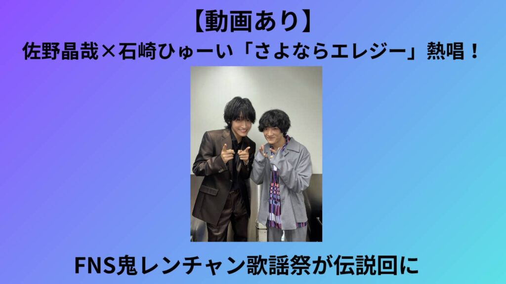 2025年10月放送の「FNS鬼レンチャン歌謡祭」で披露された、佐野晶哉×石崎ひゅーい「さよならエレジー」のコラボが大反響!本記事では、放送当日の歌唱シーンの見どころ... -