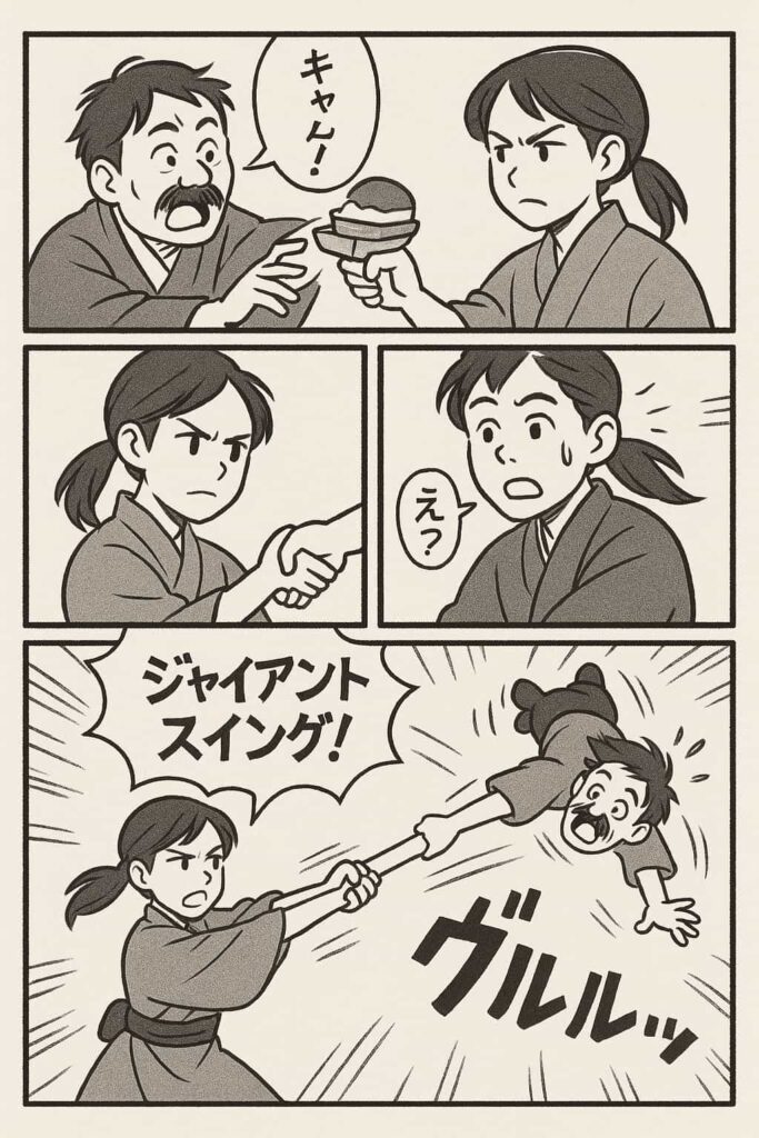 しかし、娘が差し出したお菓子を父が奪おうとした瞬間、空気が一変。トキは咄嗟に司之介の腕を取り、ぐるりと回転。まるでプロレス技「ジャイアントスイング」を決めるように父を振り回してしまうのです。