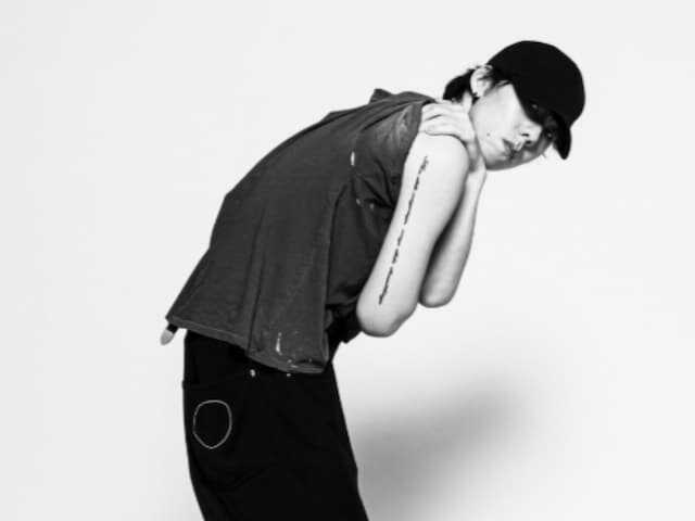 彼は黒のハットに、フランスブランド「メゾンマルジェラ」のノースリーブトップスを合わせ、あえて肩や腕のラインを強調したスタイルで登場。照明が当たるたびに筋肉やタトゥーのラインが浮かび上がり、楽曲の持つ生命力やリアリティをより際立たせていました。