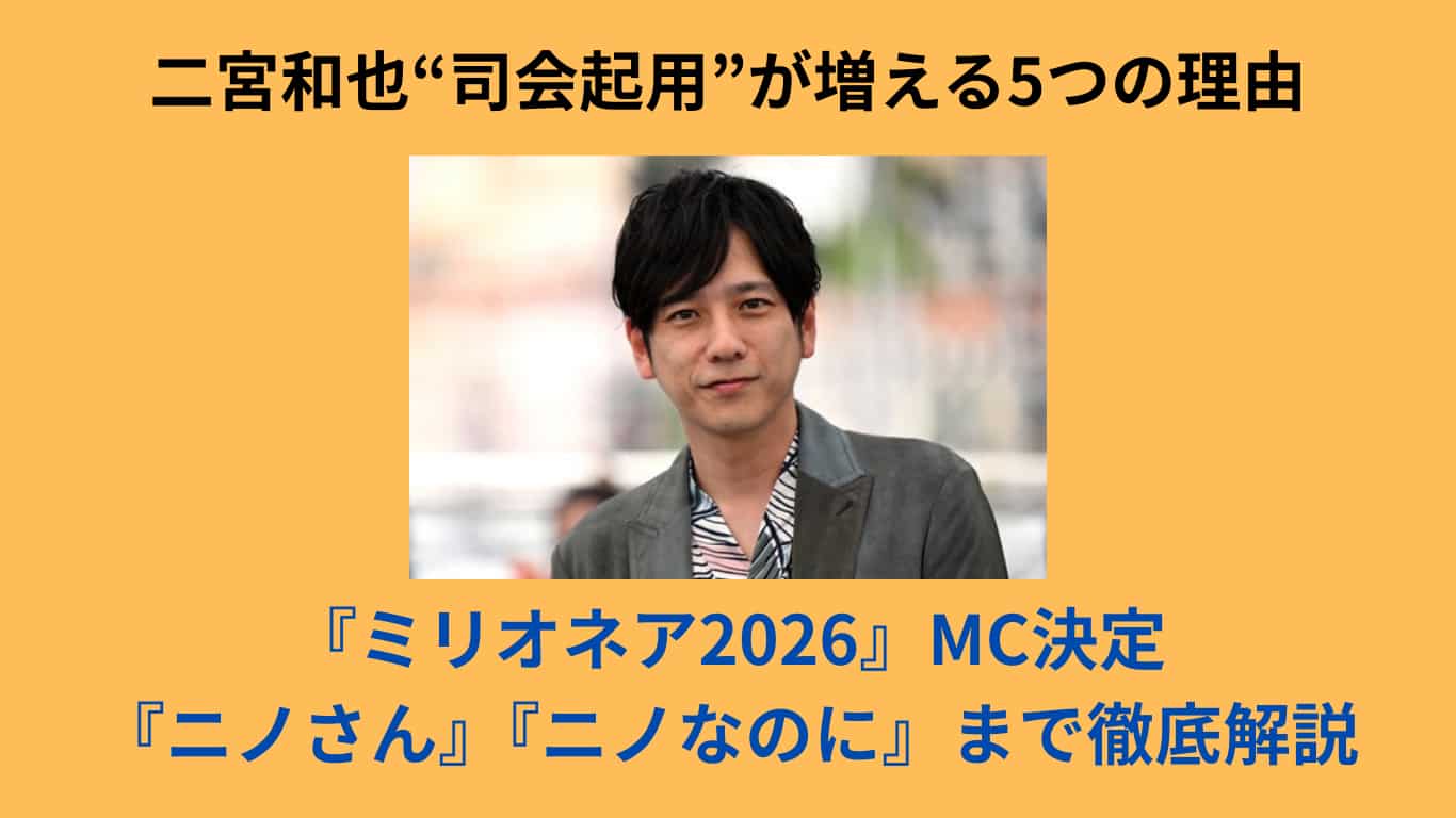 2026年新春、『クイズ$ミリオネア』のMCに抜擢。重い緊張感と楽しい雰囲気を行き来できる司会は限られていますが、二宮さんは正解発表前の“沈黙”や一言コメントの温度を細かく調整できる人。