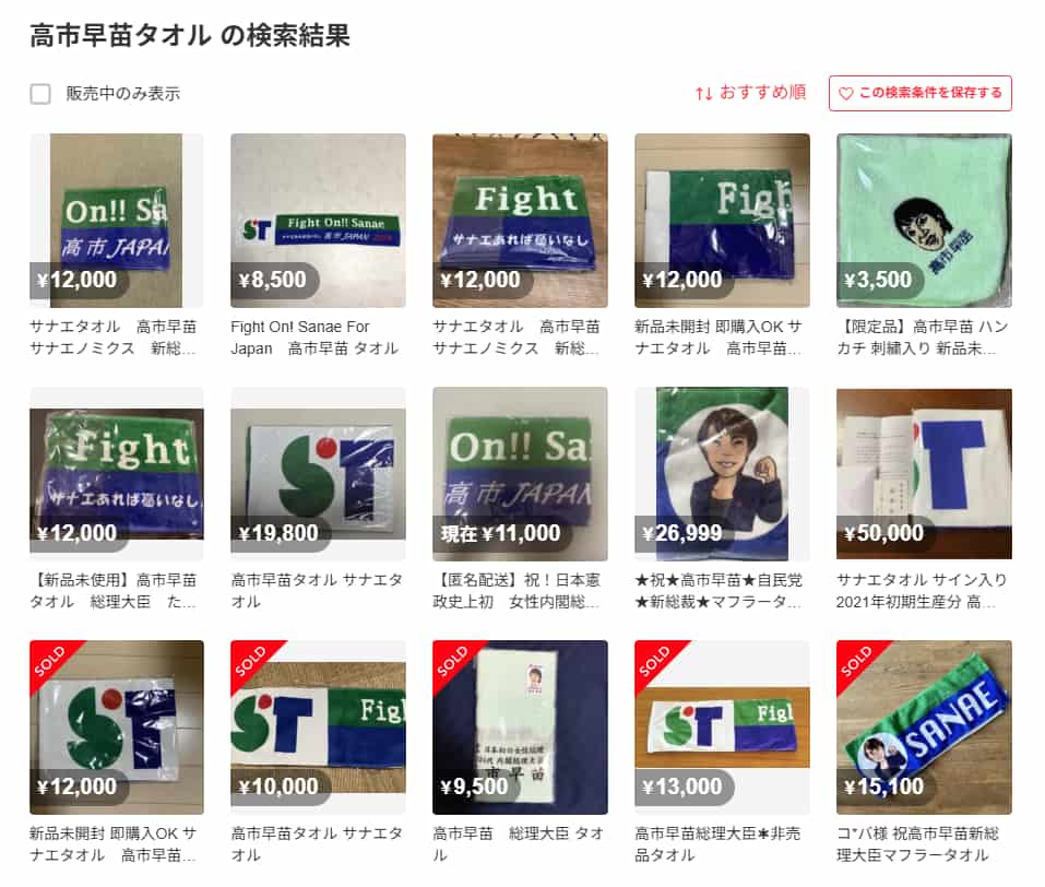 - 就任報道が出た直後、SNSで「サナエタオルが高値で売れている」という情報が拡散。